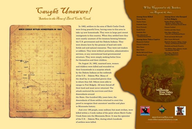 “Caught Unaware,” the marker dedicated to Family and Friends of Dakota Victims on August 18, 2012. The monument is on the grounds of the Renville County Historical Society in Morton, MN. To read the wordage better, click on this PDF document: Caught Unaware.pdf