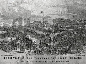 This was an extremely difficult and busy time for Lincoln as he was dealing with the burden of the Civil War as well. He asked two staff members to review the transcripts. They recommended that 39 (one was pardoned) Dakota met Lincoln's criteria. The hangings took place on December 26, 2025 in Mankato, and became the largest public execution in the United States in response to the largest massacre by Indians. More detail on this grim event in Minnesota's history is found in Curtis Dahlin's book, "The Dakota Uprising - A Pictorial History," pgs. 248-253.