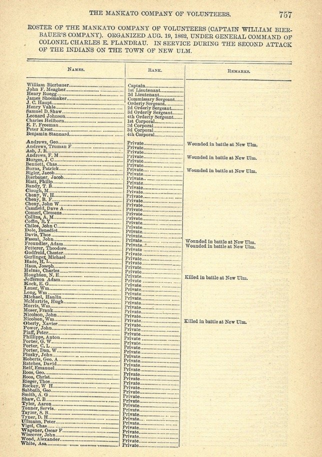 A roster of the Mankato Company can be found in the following lists from: Minnesota in the Civil and Indian Wars, 1861-1865 (St. Paul, 1891).