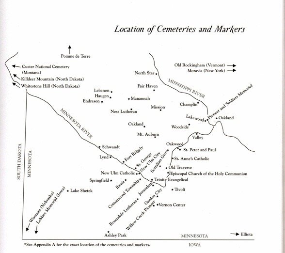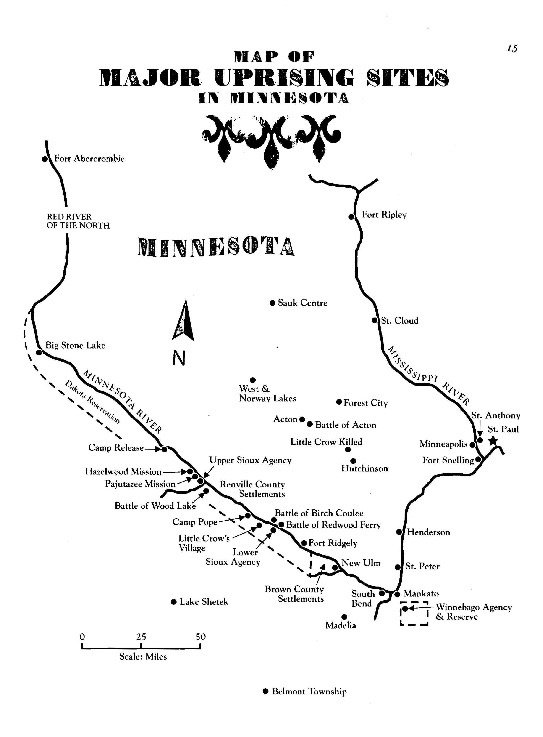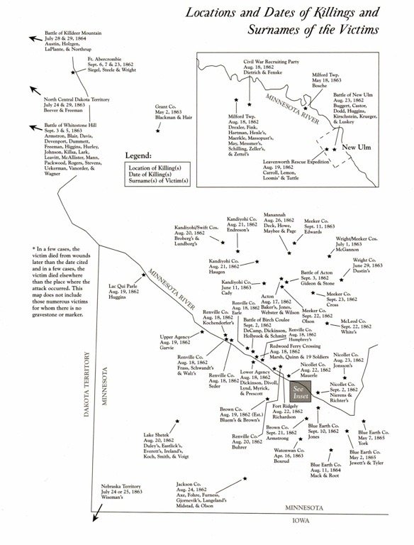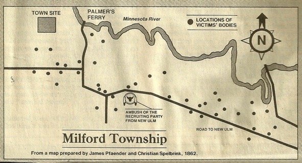 This map is one of 19 original maps from Gregory Michno's "Dakota Dawn.” It shows the cabins, creeks, the Redwood ferry and the Indian villages near Beaver Creek and Birch Coulee Townships. Descendants of these families have been located: P. Pereau, C. Cardinal, C. Clausen, C. Witt, D. McConnell, E. Piquar, L. LaCroix, J. Kumro, G. Buerry, J. Vogtman, A. Bahlke and B. Eisenreich. If you are related to any of the settlers shown on the map, please email me about your family. For more about Michno's book, see the link, Books Relating to the 1862 Dakota War.