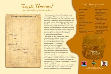“Caught Unaware,” the panel dedicated to Birch Coolie Creek settlers on August 18, 2012. The monument is on the grounds of the Renville County Historical Society in Monton, MN.